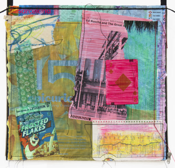 Paper, cardboard, acrylic paint, plastic bubble wrap, playing card, maps, plastic foam, wool felt, metal zipper, cotton thread