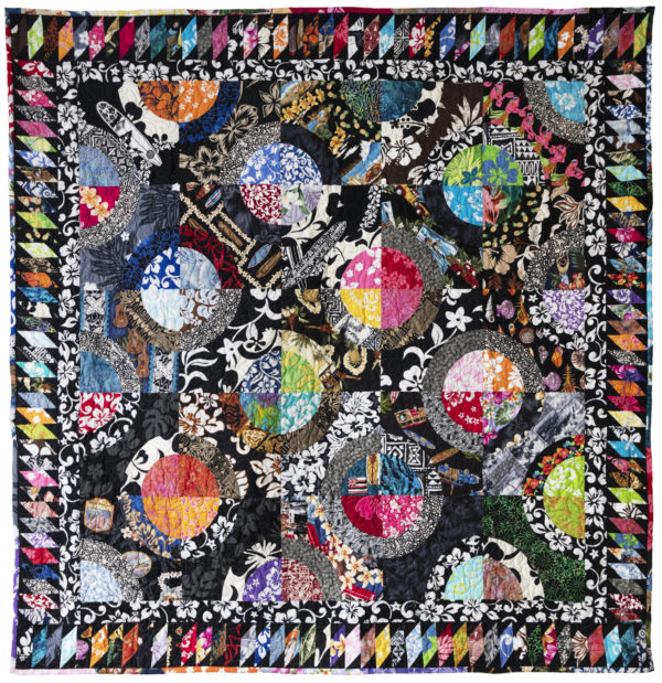 Modeled after“Meandering Dots”,I wondered, What if… I used all Hawaiian themed fabrics to recreate this quilt? I spent many summers on Maui, collecting ideas along with textiles, from the fabulous shop, “Sew Special”.Isn’t it great, how all the black and white fabrics create a resting place for your eyes, and make the bright colors pop? Can you find the dancing lobsters, Hawaiian flag, and ukuleles?