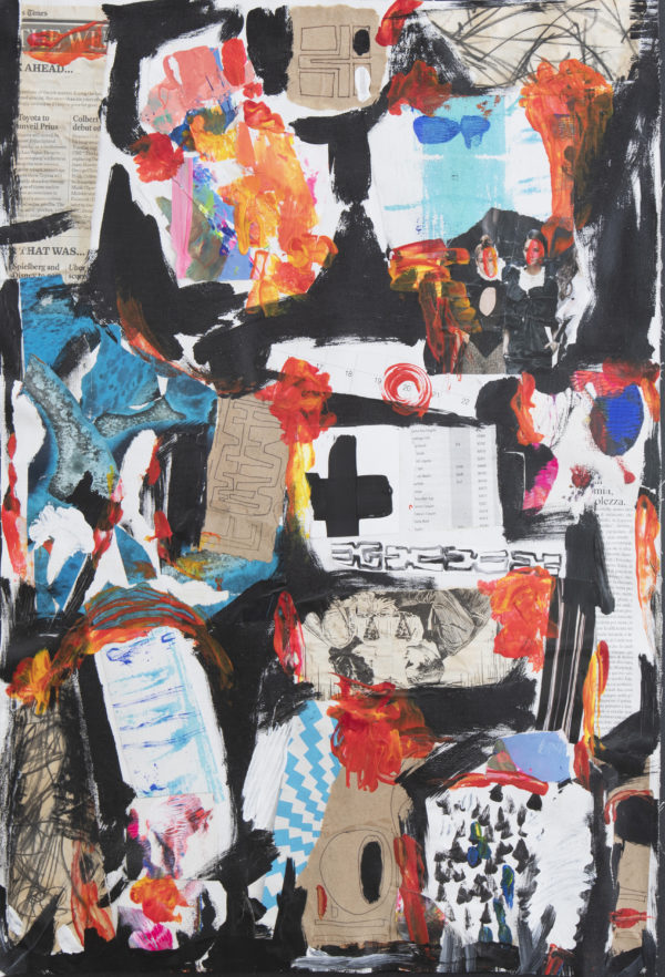 I had recently completed a “happy” painting, mostly pink hues and decided to go to a darker subject, in color and thought. There is so much to see in this piece – more to me every time I look: the bulls head in the upper center; the alien in the middle right with a purple eye; half a woman’s face in the lower right; a man with headphones in the upper left; and the cross in the center. What do you see?