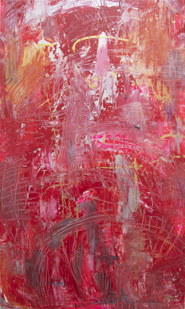 On a brisk LA evening, fellow artist and friend, Don Langworthy, issued a critique challenge – to come together in a group to explore paint using music, poetry, literal and emotional descriptions – without expectations.  Along with an accidental paint-can spill, led to this breakthrough painting. Additional color provided by metallic paint and pastel.