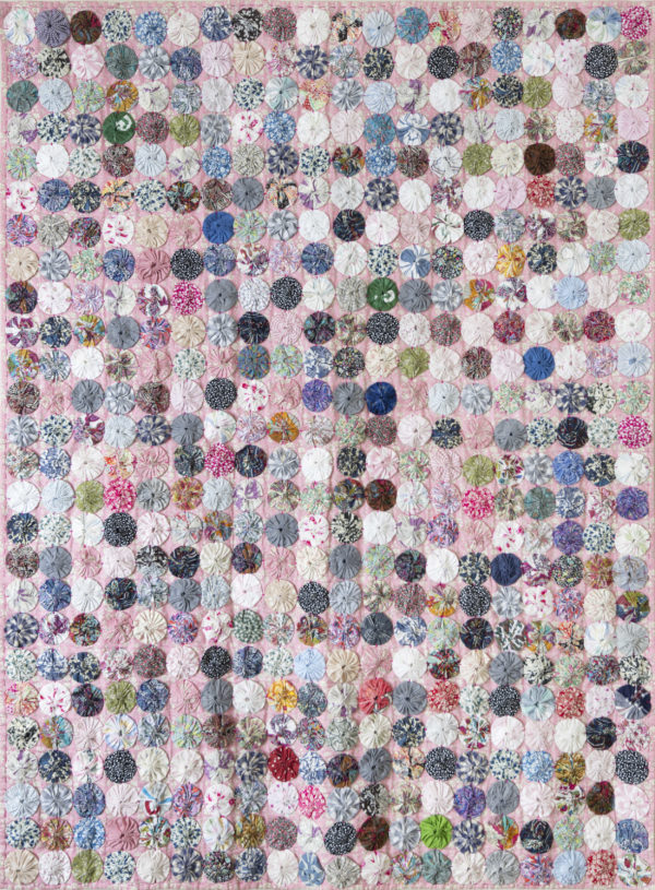 A featured design in Stitch Magazine, this quilt is composed of over 500-all English fabric circles. When I couldn’t get consistency in the size of the circles (preventing a typical hand-sew construction), I built the base quilt and added the yo-yos on top. On the reverse side, the hot pink attaching stitches form a secondary pattern.