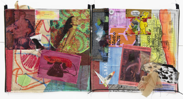 I love collecting printed materials from my travels. Spain always has much to offer, from mini catalogs at Disigual, to airport maps, and snack wrappers – it’s all in fun. Painting over papers let’s you express texture and see differently, evoking new design patterns. Bear includes a cutting of my painting pants and wax paper from my notebook (separates painted pages from sticking together!)