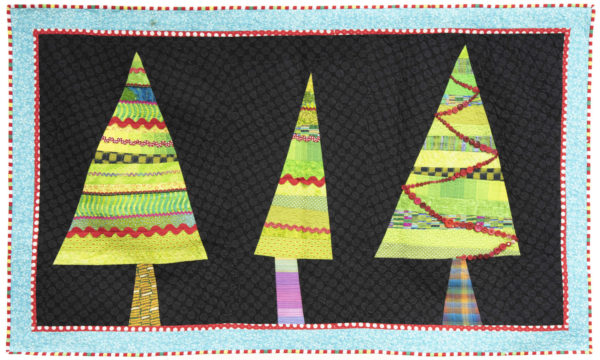 A fun collaboration with Mary Lou Weidman. We each got a quilt out of this – stitching strips of fabric together for trees. To answer your question, yes, it took many hours to sew the button garland. Isn’t turquoise a fun addition to holiday red and green?