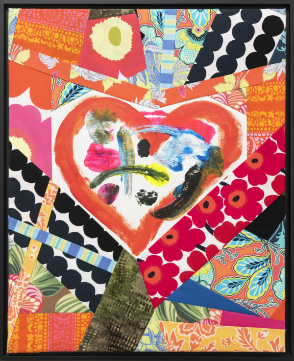 My first foray into experimenting with a painted acrylic centerpiece, surrounded by collaged and stitched fabric pieces. Much like a quilt, each print or solid cotton fabric is specially auditioned to coordinate with the centerpiece. I love how the fabric brings you in and attracts, rather than detracts.