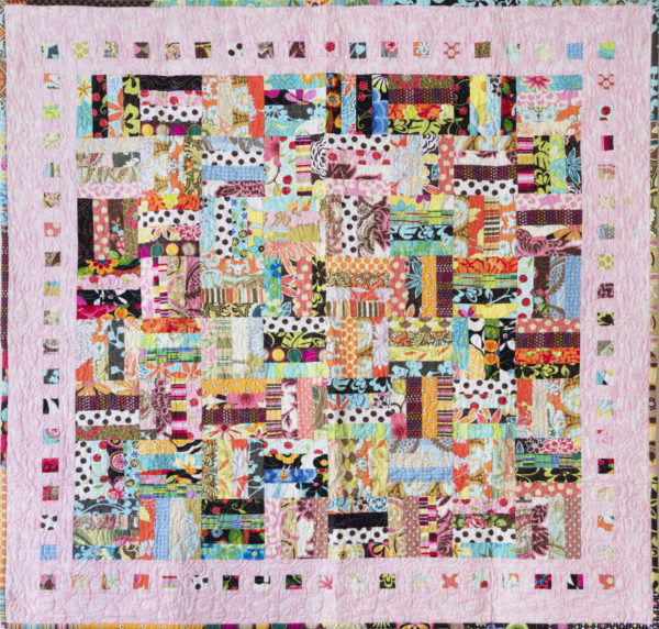 This quilt featuring “rail fence” style blocks was made from leftover fabrics from quilts made for my sisters and sisters-in-law. Bold graphic fabrics along with modern designs by Amy Butler, go effortlessly well together. The floating border is a favorite trick to fool the eye.