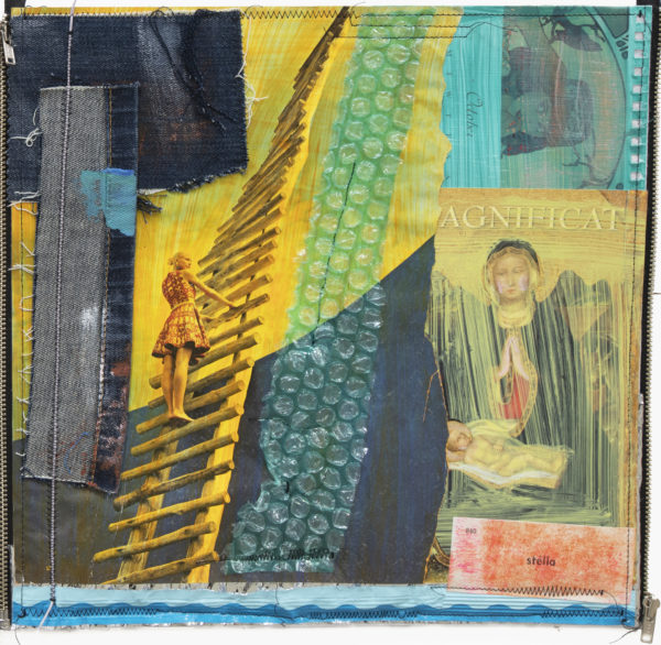 Paper, cardboard, acrylic paint, plastic bubble wrap, magazine, calendar page, recycled clothing, plastic foam, wool felt, metal zipper, cotton thread